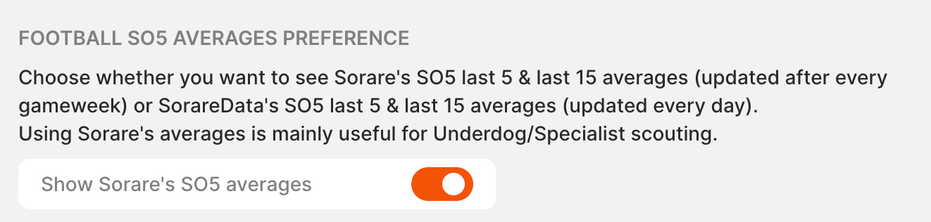 Cependant, nous sommes conscients que la décision de montrer les données les plus récentes a causé des différences dans nos moyennes L5 et L15, qui ont parfois montré des joueurs qui étaient éligibles en Underdog ou Specialist même s'ils ne l’étaient pas sur Sorare. Pour résoudre ce problème, nous permettons maintenant aux utilisateurs de SorareData de décider quelles moyennes ils veulent voir. Pour passer aux moyennes de Sorare, il suffit de cliquer sur le nom de votre manager en haut à droite de notre site et de sélectionner Settings & Membership, où vous trouverez le bouton permettant de sélectionner votre préférence.