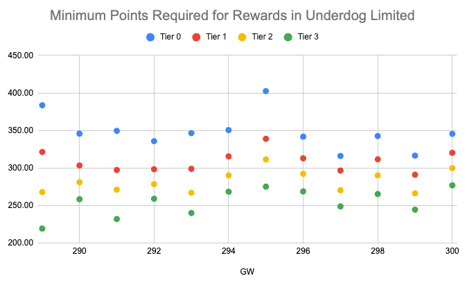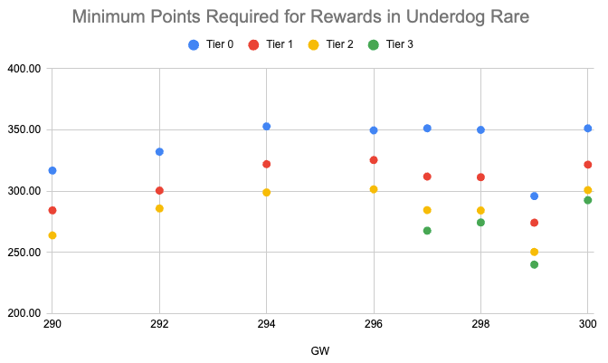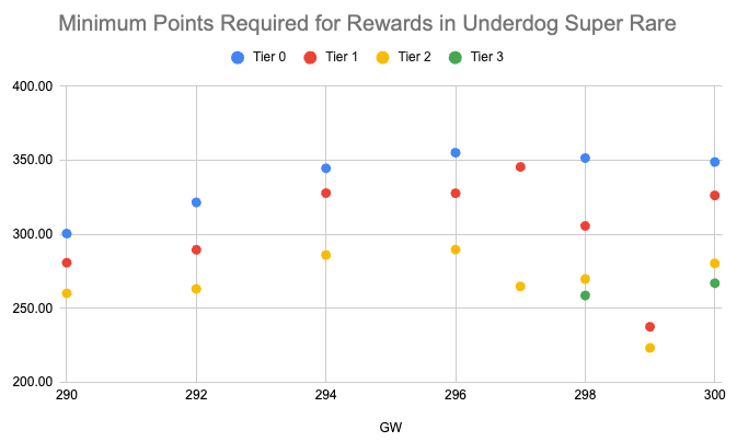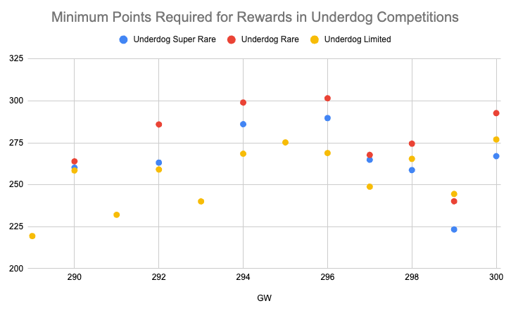 Avec seulement 11 GWs utilisant les dernières règles en Underdog (quatre joueurs ayant une moyenne de 50 ou moins), nous ne disposons pas d'un échantillon significatif pour notre analyse. Et si les pools de reward semblent se stabiliser, les Limited ont toujours eu des Stars,T1,T2,T3 alors. que les rares n'ont pas récompensé de T3 avant la GW 297, et en Super Rare il n'y en a eu qu'aux GW 298 et 300. Cela dit, regardons le nombre minimum de points requis pour gagner des récompenses par GW pour chaque rareté :