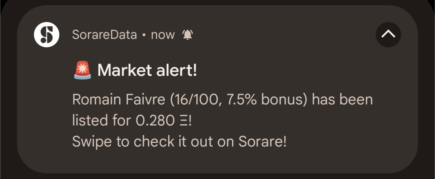 Et chaque fois qu'une carte est mise sur le marché à un prix inférieur au prix fixé, vous en êtes informé directement sur votre téléphone, si vous ayez téléchargé l’application mobile SorareData bien sûr.