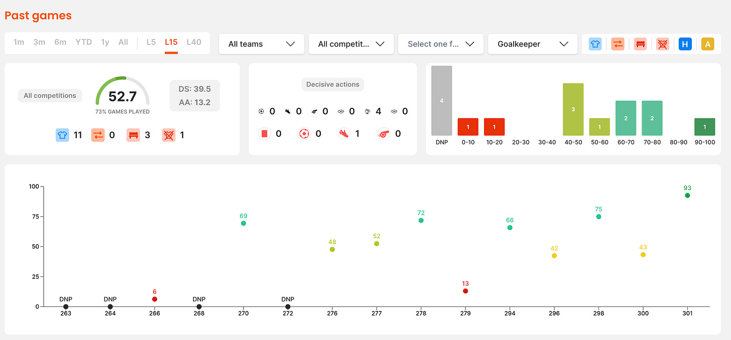 Il est un peu surprenant qu’un joueur de la stature (et du prix!) de Donnarumma soit un participant régulier au concours Underdog, surtout si l'on considère qu'il peut être utilisé en Champion Europe, en U23 ou en All Star, mais étant donné son potentiel de scorer de manière importante et régulière, il est peut-être une option plus viable pour réaliser un gros score parmi les joueurs ayant une moyenne de 50 ou moins sur leurs 15 derniers matchs.