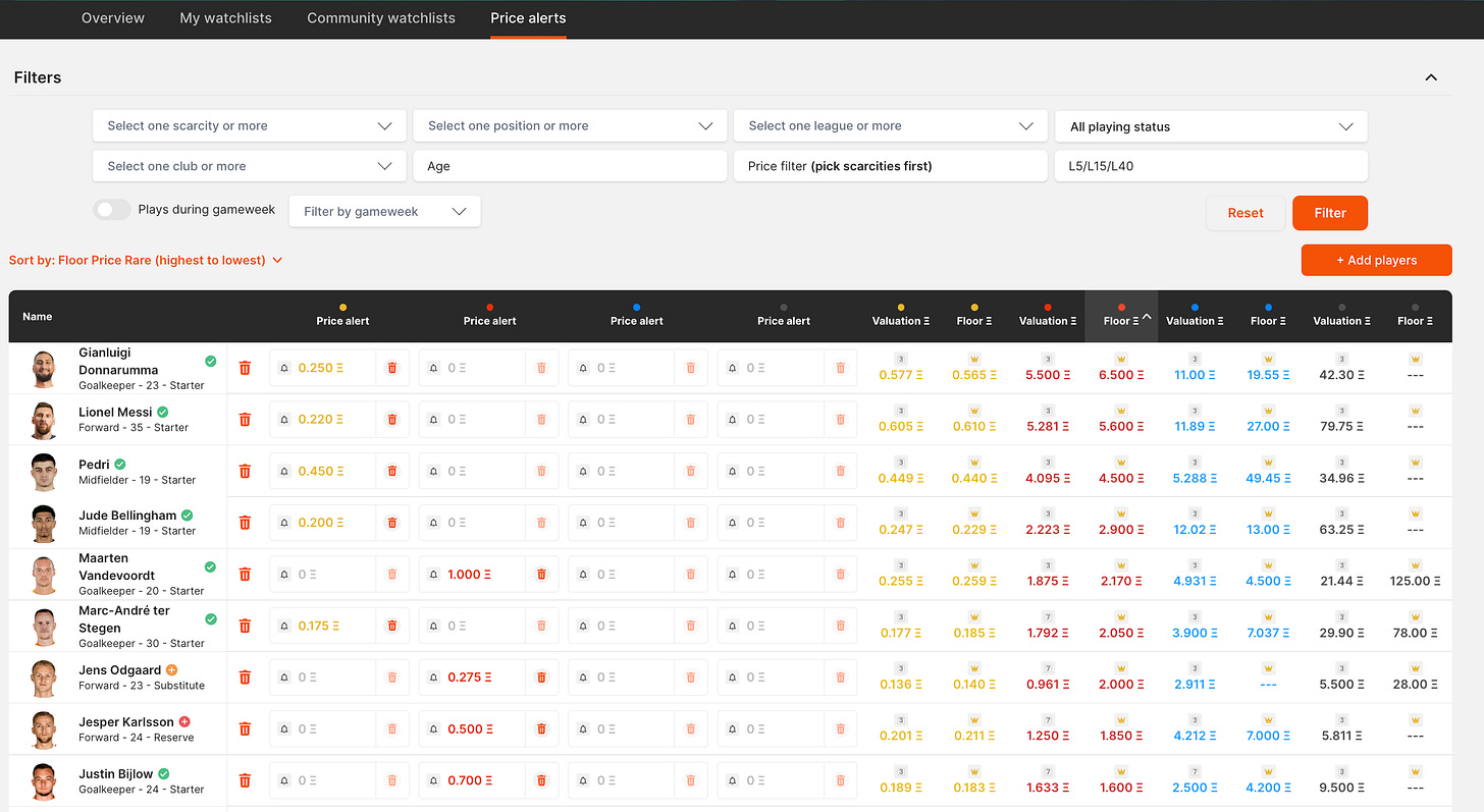 De nombreux utilisateurs de SorareData utilisent les alertes de prix pour être avertis lorsqu'une carte est mise en vente sur le marché secondaire en dessous d'un certain prix. Nous avons rendu encore plus facile la visualisation et l'organisation de toutes vos alertes de prix. Grâce à nos watchlists récemment remaniées, vous pouvez désormais suivre toutes vos alertes de prix sur une seule page, et il ne faut que quelques secondes pour créer ou mettre à jour de nouvelles alertes.